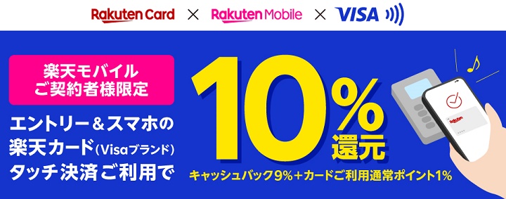 楽天モバイル契約者限定のキャンペーンですが、VISAタッチ決済で10%還元キャンペーンです。