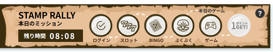 ログイン、スロット、BINGOなど、画像に記載されているゲームを1日ですべてこなせば1ポイント獲得できます。