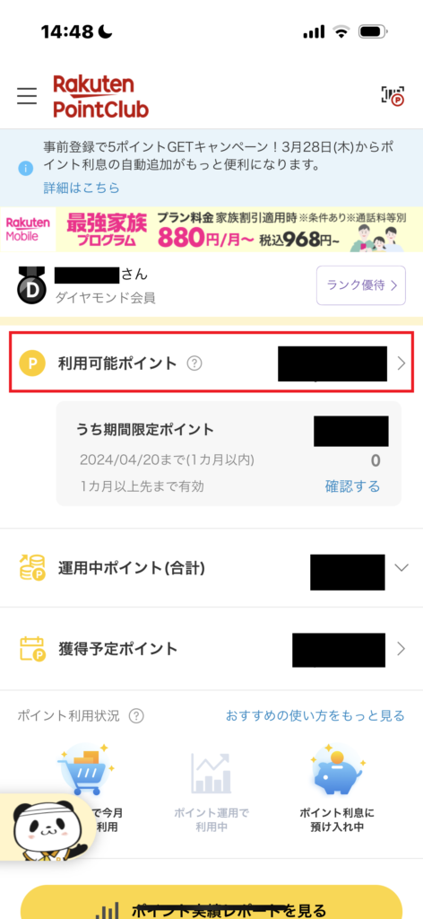 楽天ポイントクラブアプリの「利用可能ポイント」というところをクリックすると、週1回だけ1ポイント獲得できます。