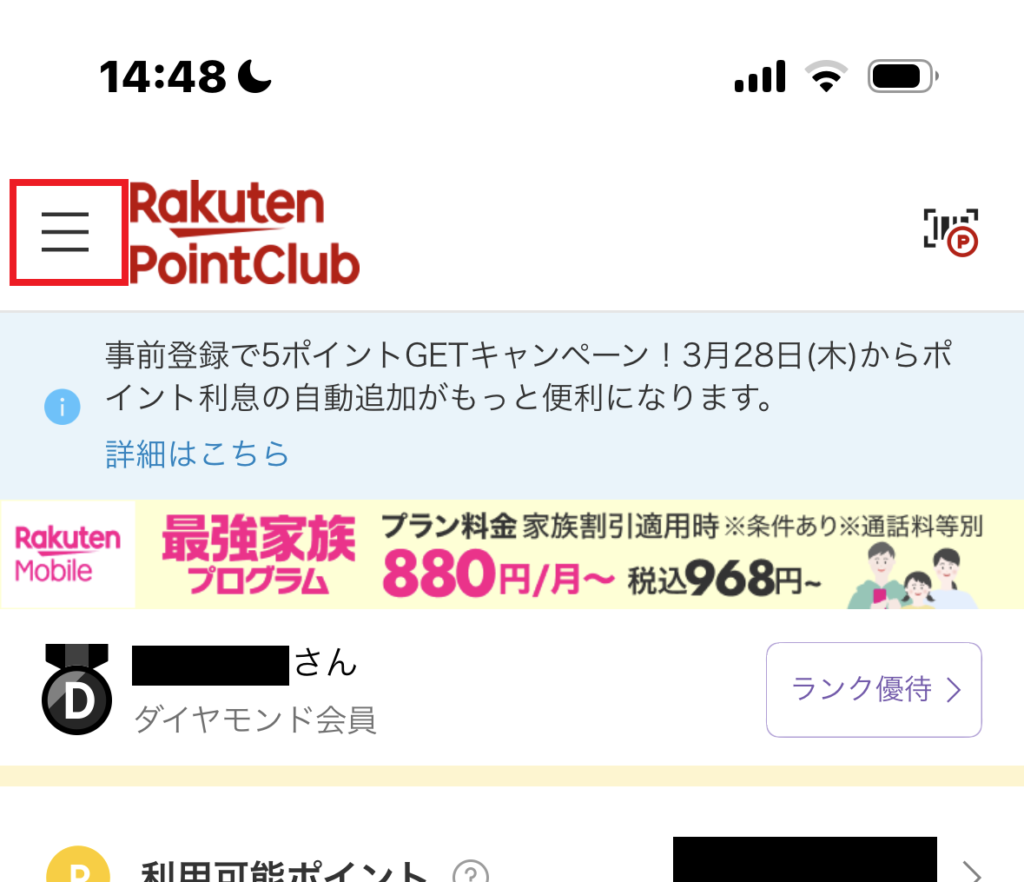 ①楽天ポイントクラブアプリ左上の三本線をクリック
