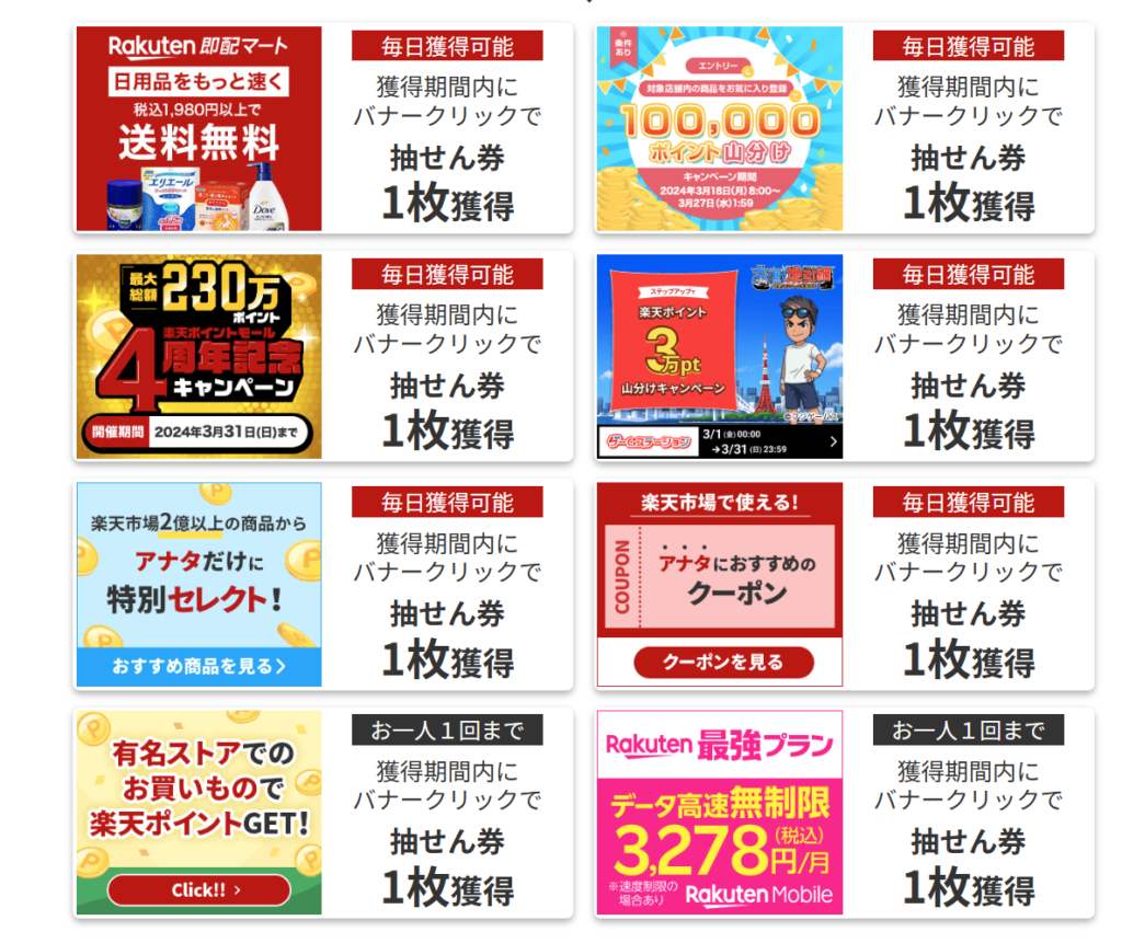 楽天ポイントモールサイトトップに、クリックすると宝くじ券を獲得できるコーナーがあります。