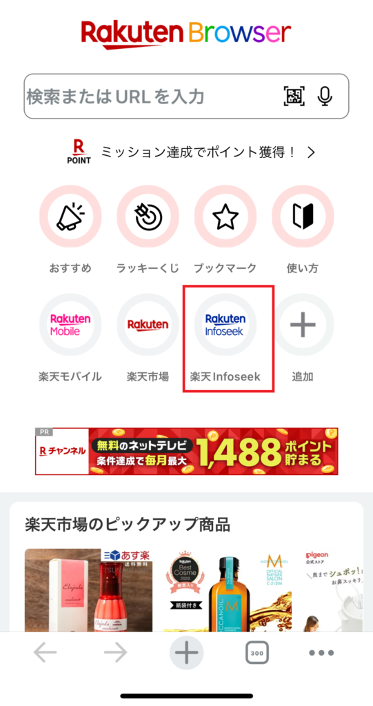 ①楽天ブラウザアプリを起動し楽天infoseeekをクリック
