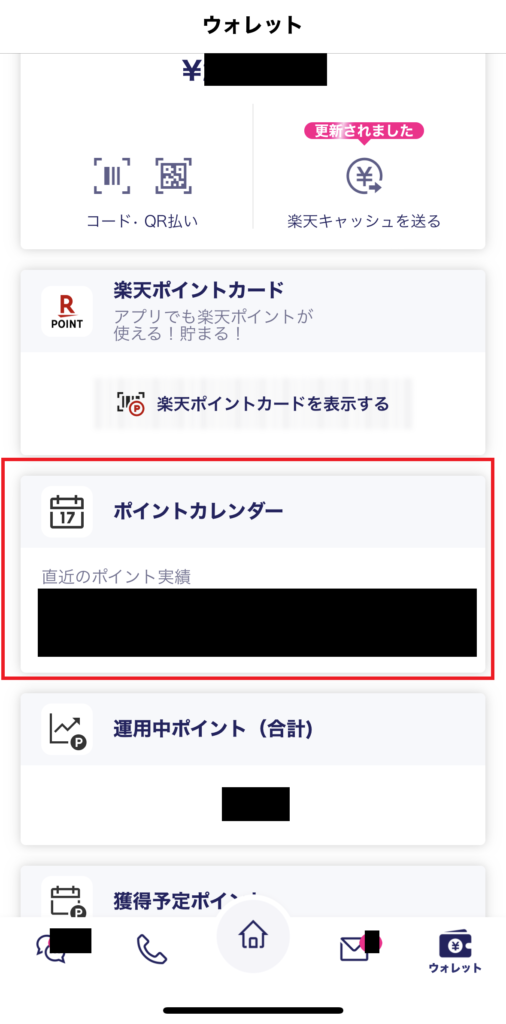 楽天LINKアプリ内右下のウォレットをクリックし、ポイントカレンダーをクリックします。